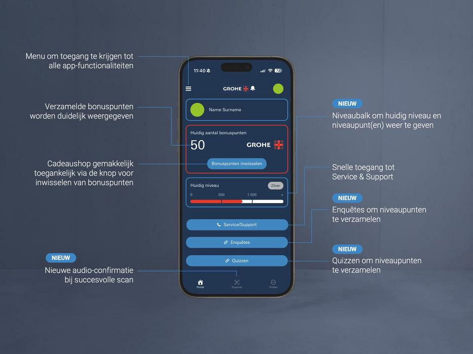 *Bonuspunten: verdien bonuspunten door QR-codes te scannen of UPI-codes van GROHE-producten in te voeren. Je kunt deze punten inwisselen voor beloningen zoals cadeaubonnen, vouchers of merchandise.